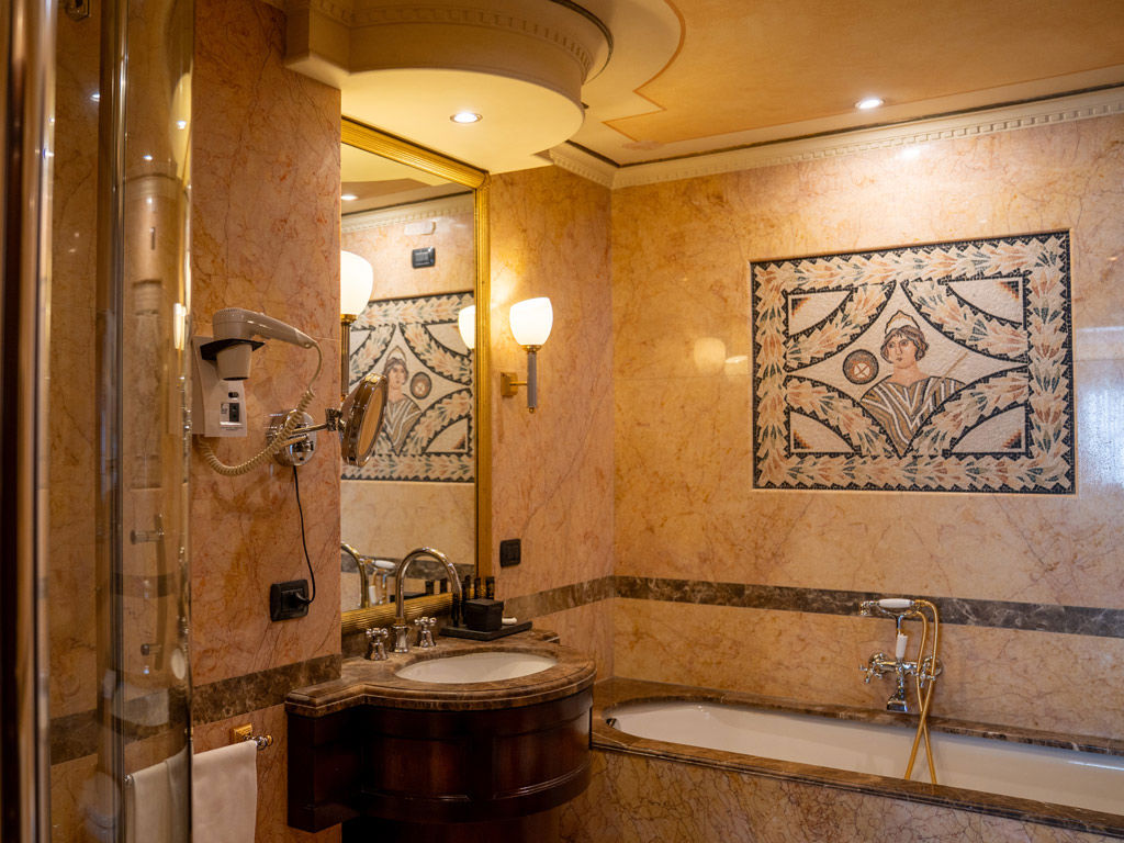 La nuova Velvet Suite offre un’ampia metratura con camera da letto e salone separato dotato di angolo bar e area working dedicata, oltre a un bagno impreziosito da marmi intarsiati e mosaici.