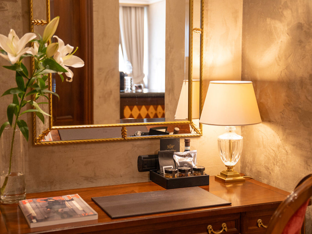 L’ambiente è reso unico da un lussuoso rivestimento delle pareti in velluto, che avvolge la suite in un’atmosfera di eleganza profonda e sofisticata, abbinato a un moderno parquet a spina di pesce.